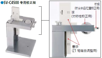 SV-C4500 系列使用專業校正規(標配附件),粗糙度0.8,通過改進使得上下兩方附帶從動件的上下圓錐測針能簡便易行地進行校正。Z1 軸增益、對稱性、探針半徑等繁瑣的校正工作一次便可完成。